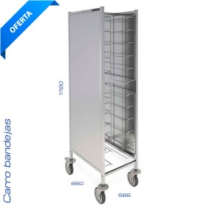 Carro bandejero para fast food y colectividades. Fabricado en acero inoxidable, estructura robusta soldada, 4 ruedas con freno dos de ellas, para bandejas de 450x350 mm / 480x370 mm / GN 1/1 / 350X270 mm. Panel cerrado.