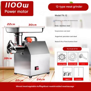Picadora de Carne profesional, con un potente motor de 850w y una producción de 120 Kg/h. Picadora Ideal para uso industrial y doméstico. Fácil desmontable para su limpieza y cambio de disco. Provisto de 2 discos con perforaciones diferentes y accesorio de cono para embutir. Agarre superior para transportar fácilmente.