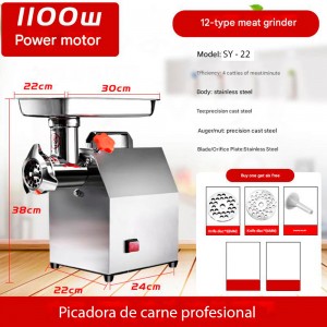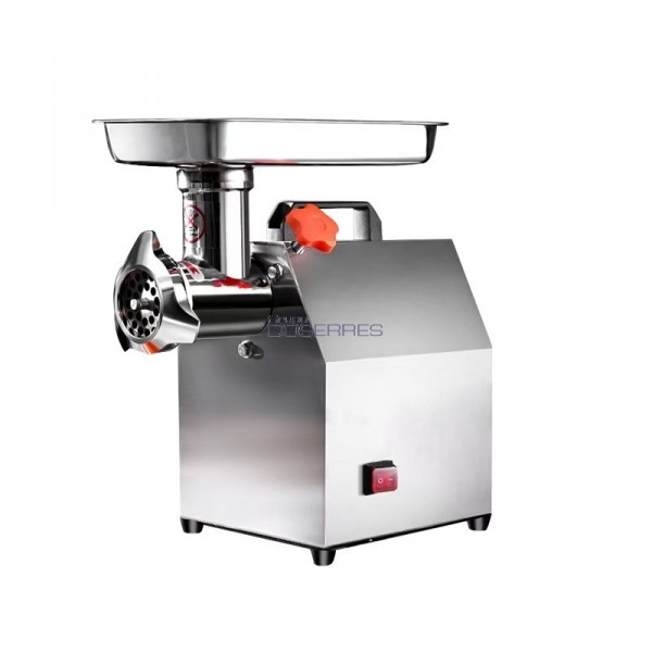 Picadora de Carne profesional, con un potente motor de 1100w y una producción de 220 Kg/h. Picadora Ideal para uso industrial y doméstico. Fácil desmontable para su limpieza y cambio de disco. Provisto de 2 discos con perforaciones diferentes y accesorio de cono para embutir. Agarre superior para transportar fácilmente.