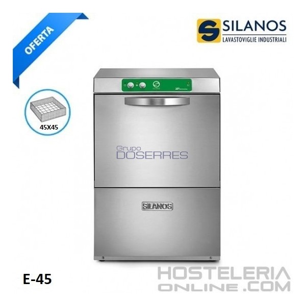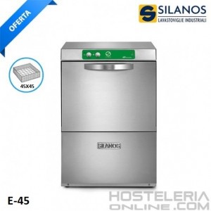 Lavavajillas E-45 Silanos para restaurantes. Lavavajillas industrial especial para hostelería y cocinas profesionales. Los inyectores de lavado están ensamblados en acero inoxidable. Facilidad de limpieza gracias a las esquinas redondeadas, Temperatura de aclarado hasta 90ºC lo que garantiza una mayor higiene. Sistema patentado SILANOS en ahorro de energía de hasta un 35% respecto a otros fabricantes.