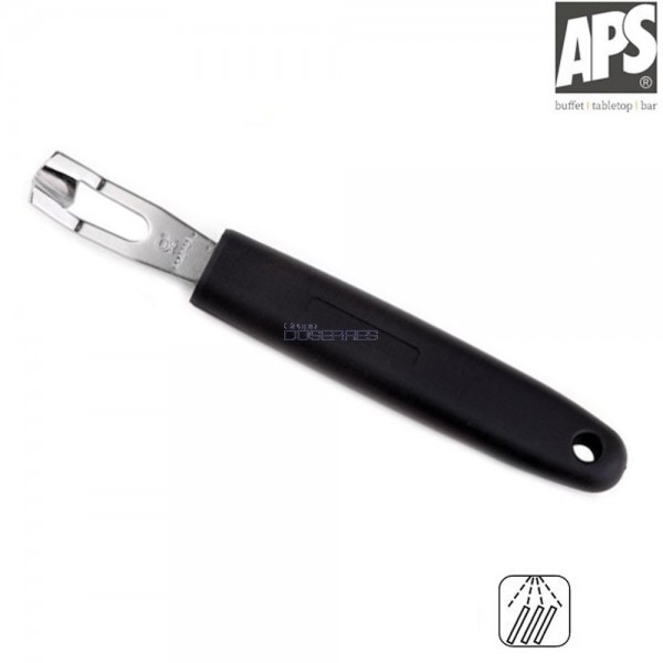 Excelente decorador de cítricos indispensable en su cocina y para el mejor barman, nos permite decorar cockteles, esculpir líneas o hacer dibujos sobre fritas o verduras. Fabricado en acero inoxidable con borde afilado y empuñadura de nylon y fibra de vídrio.