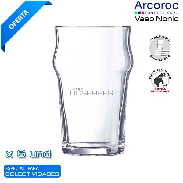 Vaso Mod. Nonic en Vidrio transparente de 28cl. Vaso NONIC fabricado por Arcoroc. Ideal para Cerveza, refrescos y otros tipos de bebidas, la particularidad es que es apilable y de fácil sujección en la mano. Vaso nonic de 28 cl